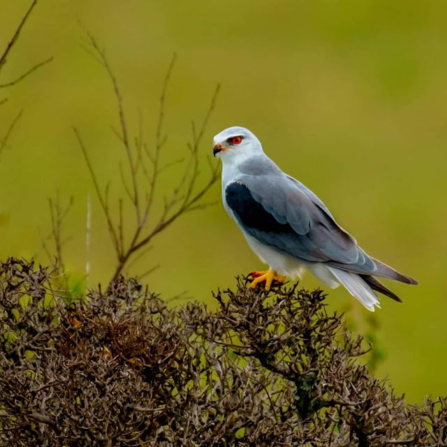 The black-winged kite is found in various habitats, including grasslands, marshes, and agricultural areas across parts of Europe, Africa, Asia, and Australia. Its diet primarily consists of small mammals like rodents, along with insects and birds.